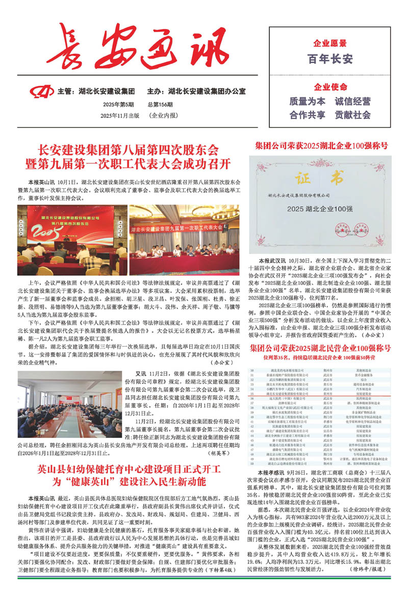 • 2025-09-27 湖北長安建設集團股份有限公司 榮獲2025湖北民營企業(yè)100強稱號,位列第35名